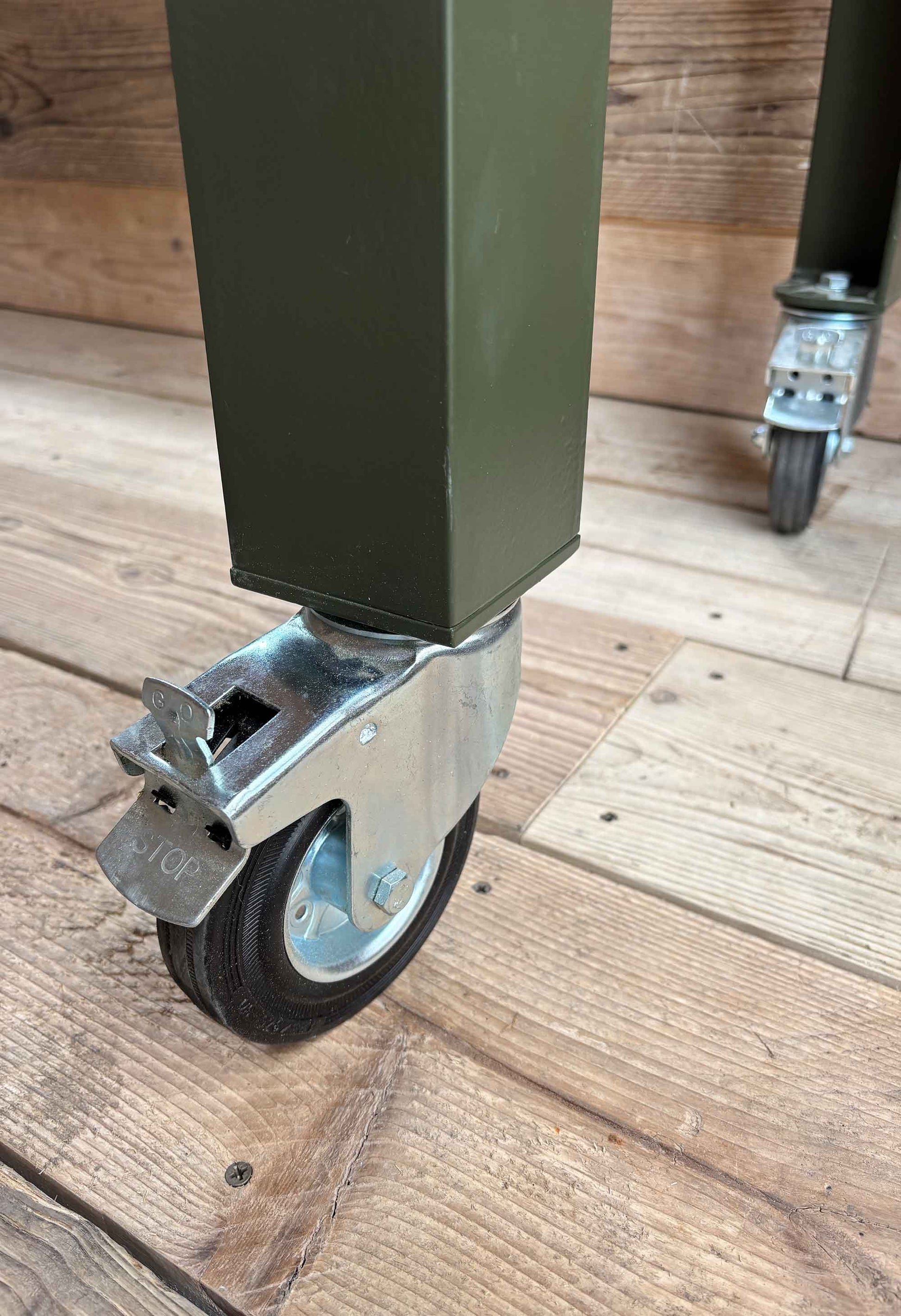 Galvanised steel top on powder coated steel frame and legs in a range of colours. All of our tables come with caster wheels with brakes, allowing them to be easily moved around and fixed in position. This versatile table is great for heavy duty activities, but equally good for home office use or shop displays.